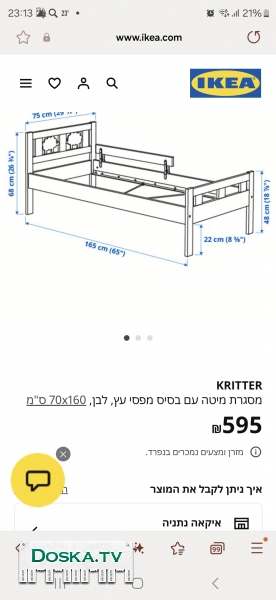 Продаю детскую кроватку Икеа.Дно кровати вырезали сами из плотного полотна дерева.есть бортик(цена в магазине 595 ш) кроватке в подарок отдаю матрац(цена в магазине 300 ш),абсолютно новый,не был в использовании. Кроватка в хорошем состоянии,легко собирается .Самовывоз из Бат Ям.Есть лифт.